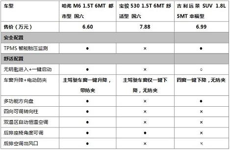也許有人會問,哈弗M6不是主打“起售價(jià)6萬6”嗎?不是主打超高性價(jià)比嗎?那在入門車型的配置上又會如何呢?讓我們來看看以哈弗M6 1.5T 6MT 都市型 國六(指導(dǎo)價(jià)6.60萬元)、寶駿530 1.5T 6MT舒適型 國六(指導(dǎo)價(jià)7.88萬元)和吉利遠(yuǎn)景SUV 1.8L 5MT幸福型(指導(dǎo)價(jià)6.99萬元)這三款同為車系入門車型的對比,配置差異如下: