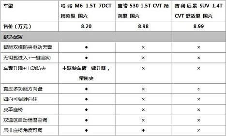 在舒適配置方面,哈弗M6堅(jiān)持人性化理念,8英寸彩色大屏、多功能方向盤、智能雙模防夾電動天窗、雙溫區(qū)自動恒溫空調(diào)、無鑰匙進(jìn)入+一鍵啟動、后排座椅角度可調(diào)等便捷實(shí)用配備,讓駕乘者盡情享受舒適的行車體驗(yàn)。同樣,以上述三款車型為對比對象,舒適配置差異見下表: