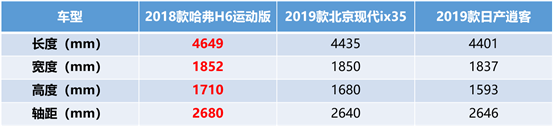 表格能帶給人們最直觀的感受,哈弗H6運(yùn)動版的長度、高度以及軸距都比現(xiàn)代ix35和日產(chǎn)逍客大,古人有云:“一寸長一寸強(qiáng)”,軸距越長,車內(nèi)的縱向空間就越大,乘坐感受就更寬敞、更舒適。與此同時,更大的車身尺寸也會帶來更大的儲物空間,這也是很多消費(fèi)者購買SUV很看重的地方,哈弗H6運(yùn)動版的儲物空間達(dá)到了808L,而最大可擴(kuò)展至2010L,令兩位對手羨慕不已。
