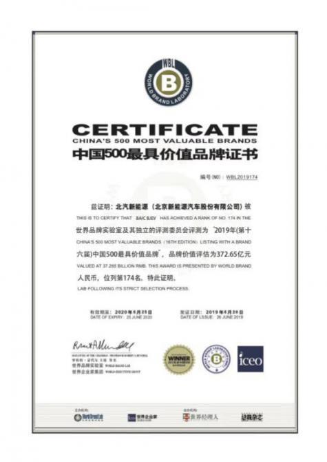 北汽新能源二度上榜中國(guó)500最具價(jià)值品牌榜單