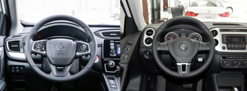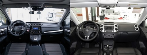 進(jìn)入車內(nèi),大眾途觀的內(nèi)飾設(shè)計(jì)有著家族風(fēng)格,全黑內(nèi)飾的設(shè)計(jì)也較為運(yùn)動(dòng),加上層次感比較分明,各種人性化的設(shè)計(jì)也較出彩,總體上置身其中不會(huì)有不適的感覺(jué)。本田CR-V的內(nèi)飾設(shè)計(jì)更注重突出居家感,諸多控制按鍵都集中在中控臺(tái)中央位置,稍顯擁擠。