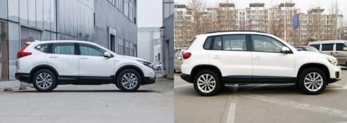 來(lái)到側(cè)面,雖然都定位于緊湊級(jí)SUV,但是途觀的軸距為2684mm,比本田CR-V的2660mm還是更加出色,而長(zhǎng)寬高尺寸分別為4506*1809*1685mm,在高度上也大于本田CR-V。從側(cè)面看過(guò)去,大眾途觀的造型依舊很時(shí)尚,而本田CR-V的尾部線條則稍顯臃腫。