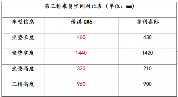 當下,很多MPV車型的第三排座椅都備受詬病,給家人“小板凳”式的空間感。而從如下表格第三排數(shù)據(jù)可知,傳祺GM6的坐墊長度、寬度、高度均優(yōu)于吉利嘉際。傳祺GM6第三排空間實用性很高,當?shù)诙抛握{(diào)到最靠后位置時,即使父母體格偏胖,坐進第三排時,腿部空間仍有剩余。