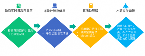 與此同時,極光還擁有千億級別的行為日志記錄、PB級別的數(shù)據(jù)存儲層以及深度學(xué)習(xí)特征工程、分類聚類算法等技術(shù),打造了包含四大級別、數(shù)百個標簽的用戶微觀畫像體系。