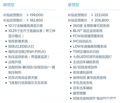 從配置表看,作為入門版的福特領(lǐng)界EV靜領(lǐng)型就已擁有了10.25寸全尺寸液晶儀表盤,且附帶三種顯示模式。同時,10.1寸的全觸摸高清顯示屏、胎壓監(jiān)測系統(tǒng)(帶溫度監(jiān)測)、倒車影像系統(tǒng)、矩陣式LED前大燈、防夾式電動全景天窗、遠(yuǎn)程控制將會作為該款車型的標(biāo)準(zhǔn)配置,滿足中國城市家庭對高品質(zhì)的需求。