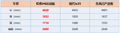 車身、軸距越長,意味著車內的縱向空間會越大,腿部空間會更寬敞,乘坐舒適度也就更高。哈弗H6運動版的車身尺寸為4649*1852*1710mm,軸距2680mm,在同級車型中,是名副其實的大塊頭,更傲視現代ix35、逍客等合資SUV。