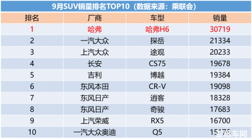 根據(jù)榜單顯示,哈弗H6依然尋不到任何對手,以唯一突破3萬輛的銷售成績遙遙領先登頂冠軍,而排名第二、三名的大眾探岳和大眾途觀銷量都徘徊在2萬輛上下,與第一名相差1萬余臺,其他品牌則未能突破2萬臺大關??梢姽6在SUV市場一枝獨秀,不論是自主品牌還是合資車企都無法撼動其銷冠地位。
