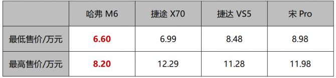 先來看各個車型的售價。哈弗M6指導(dǎo)價區(qū)間為6.60-8.20萬元,捷途X70以6.99-12.29萬元入市,捷達VS5的售價在8.48-11.28萬元之間,而宋Pro的指導(dǎo)價為8.98-11.98萬元。