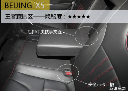 所謂王者藏匿區(qū),堪稱為極致藏物空間,在BEIJING-X5車內(nèi),誠意推薦三處此區(qū)域。首先推薦的是后排座椅,BEIJING-X5擁有2665mm的軸距,空間非常充裕的后排也為我們提供了極為充分的創(chuàng)意發(fā)揮空間。細(xì)節(jié)之處,如后排中央扶手夾縫及安全帶卡扣槽,這兩處藏匿地點(diǎn)基本都可說是易守難攻、固若金湯。