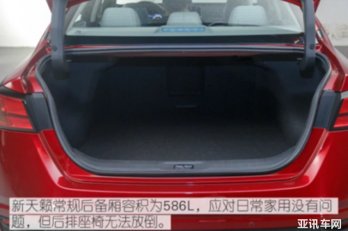 新天籟整車尺寸為4901/1850/1447mm,軸距為2825mm,寬度、高度和軸距都是四車中最小的。身高180cm的體驗者坐進前排座椅,頭部空間為4指。保持前排座椅不變,該體驗者坐進后排座椅,頭部空間還剩2指,腿部空間為1拳。新天籟常規(guī)后備廂容積為586L,應(yīng)對日常家用沒有問題,遺憾的是后排座椅不支持按比例放倒,一旦行李物品較多時,就有可能裝不下了。