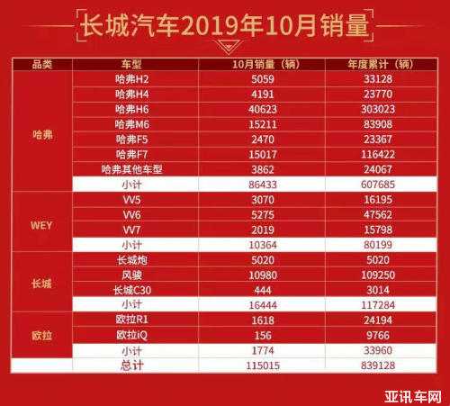11月7日,長城汽車發(fā)布10月銷量數(shù)據(jù),旗下四大品牌共銷售新車115015輛,同比增長4.48%,環(huán)比大增14.99%,1-10月累計(jì)銷售新車839128輛,同比增長6.66%。