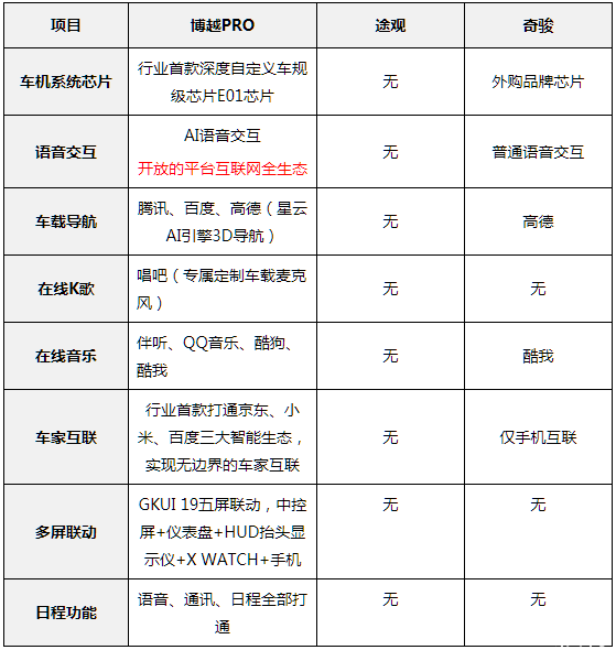 在車機系統(tǒng)方面,博越PRO全方位考慮到用戶需求痛點,搭載吉利最新智能網(wǎng)聯(lián)系統(tǒng)GKUI19,該系統(tǒng)搭載行業(yè)首款真車規(guī)級芯片E01芯片,E01的運算能力較以往提升了5倍,開機速度提升了33%,多媒體加載用時提升了55%,導航加載用時提升了67%,給用戶帶來如手機般的使用流暢度。并且貫通融合百度、京東、小米、高德、騰訊、唱吧等常用互聯(lián)網(wǎng)資源,給用戶帶來豐富的娛樂用車體驗。具體功能及軟件見下圖。