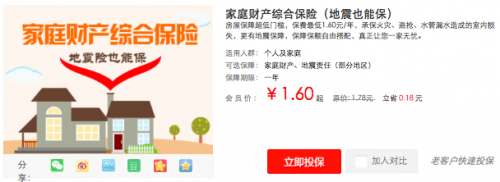 以中國(guó)人保家庭財(cái)產(chǎn)綜合保險(xiǎn)為例,可承保由于室內(nèi)自來(lái)水管道、下水管道和暖氣管道、暖氣片突然破裂致使水流外溢或鄰居家漏水造成的室內(nèi)財(cái)產(chǎn)損失。并且用戶可根據(jù)自身家裝實(shí)際情況進(jìn)行選擇保障金額與保險(xiǎn)方案,以避免不必要的保費(fèi)支出。除此外,中國(guó)人保家財(cái)險(xiǎn)還可承保火災(zāi)、盜搶等造成的室內(nèi)損失,甚至地震造成的房屋損失也可保,為用戶提供全方位的房屋財(cái)產(chǎn)安全保障。保費(fèi)最低僅需1.6元,即可保障一整年。