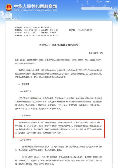 10月30日,教育部發(fā)布了《教育部關(guān)于一流本科課程建設(shè)的實(shí)施意見》,《意見》指出,全面開展一流本科課程建設(shè),樹立課程建設(shè)新理念,推進(jìn)課程改革創(chuàng)新,實(shí)施科學(xué)課程評(píng)價(jià),嚴(yán)格課程管理,立起教授上課、消滅“水課”、取消“清考”等硬規(guī)矩。