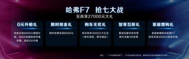 年終之際,哈弗F7推出了“搶7大戰(zhàn)”活動(dòng),購(gòu)買2020款哈弗F7可享受“0元升艙禮”、“限時(shí)現(xiàn)金禮”、“購(gòu)車無(wú)憂禮”、“智享互聯(lián)禮”、“家庭增購(gòu)禮”五重大禮,至高可享27000元的超值優(yōu)惠。