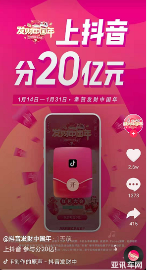 2-抖音觀看“發(fā)財(cái)中國年”KOL互動視頻,點(diǎn)擊視頻中紅包按鈕領(lǐng)取現(xiàn)金紅包和購車禮金~
