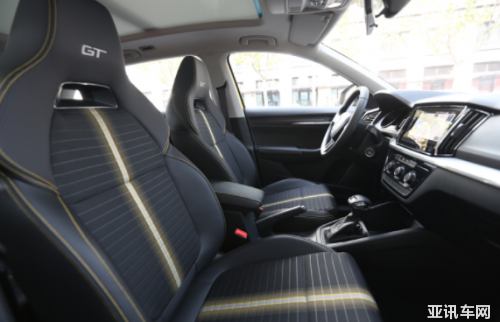 運(yùn)動(dòng)座椅可以說最能體現(xiàn)出GT風(fēng)潮的配置,座椅兩側(cè)的包裹性側(cè)翼使用了碳纖維紋路,尤其是頭枕標(biāo)注出GT字樣,材質(zhì)上運(yùn)用了皮革、織布等多面料拼接,符合人體工程學(xué)設(shè)計(jì)的曲線提供身體良好的支撐。