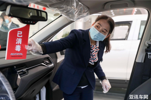 顧客到店時,各經(jīng)銷店嚴(yán)格遵守店外測量體溫,登記信息,免洗手液洗手三步流程,同時,為減少顧客接觸,銷售人員代客開門,進(jìn)店客戶還可享免費(fèi)消毒、洗車服務(wù)。