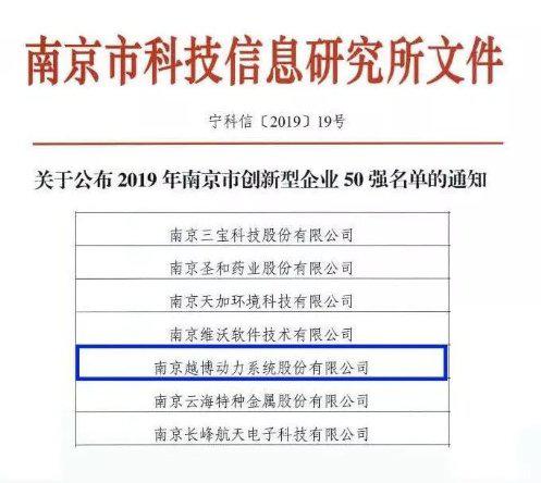 近日,南京越博動力系統(tǒng)股份有限公司(以下簡稱“越博動力”)收到南京市科技信息研究所《關于公布2019年南京市創(chuàng)新型企業(yè)50強名單的通知》寧科信〔2019〕19號,公司榮獲2019年南京市創(chuàng)新型企業(yè)50強。