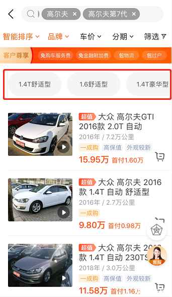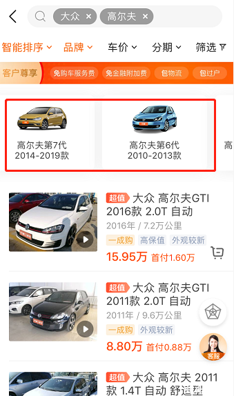 之后可以按照自己所想的條件對(duì)購(gòu)買車輛進(jìn)行篩選,如品牌、車價(jià)、車齡等。我選擇了“大眾”品牌下的高爾夫,在這個(gè)品類下,可以看到在優(yōu)信二手車APP上對(duì)車類分得相當(dāng)細(xì)致,精確的分出了高爾夫六代、七代等。查找車型可以更精確更方便。