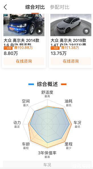 如果還想多對(duì)比幾輛車,可以把暫時(shí)看上的車添加到購(gòu)物車中使用對(duì)比功能。系統(tǒng)會(huì)對(duì)車輛的舒適度、空間、動(dòng)力等各方面進(jìn)行綜合對(duì)比,給出對(duì)比后的結(jié)果。這功能特別適合像我這樣不太懂車又有選擇困難癥的人,綜合對(duì)比下來,選哪輛車心中有數(shù)。