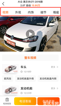 通過VR看車、視頻檢測(cè)把車輛里里外外看下來,總體感覺車況相當(dāng)透明,車輛有任何一個(gè)小瑕疵,都會(huì)在檢測(cè)報(bào)告標(biāo)注出來。