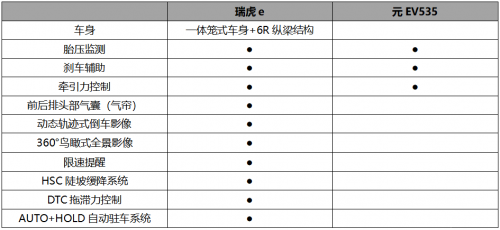 而元EV535雖然在主動安全層面同樣搭載了剎車輔助、牽引力控制及車身穩(wěn)定控制配置,瑞虎e身上搭載的諸如360°鳥瞰式全景影像、自動駐車、陡坡緩降等駕駛輔助配置,在元EV535身上并未體現,差異如此明顯的主動安全配置,對用戶駕車時的主動安全防護也是相去甚遠。