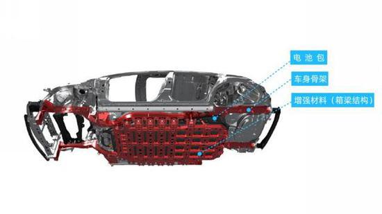 ?。?)將電池包設(shè)計成車身骨架的一部分,形成了和車身一體化的構(gòu)造,從而提高了對電池包的防護(hù)性能。同時,電池包底部還采用箱梁結(jié)構(gòu)的增強材料覆蓋,用來保護(hù)電池包免受路面上的各種干擾。此外,通過將高電壓回路設(shè)置在電池包中央,并用冷風(fēng)管把電池包內(nèi)部包圍起來的構(gòu)造形成緩沖區(qū)來保護(hù)電池單體和高壓回路。
