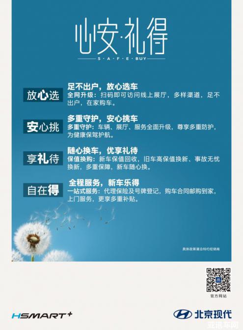 針對消費(fèi)者在疫情期間遇到的購車、用車過程中的痛點(diǎn)問題,北京現(xiàn)代特別推出了“心安·禮得(S.A.F.E. BUY)”安心關(guān)懷計(jì)劃,凡購買LA FESTA菲斯塔、新名圖、新一代ix25、新一代ix35、第四代途勝、第四代勝達(dá)中的任意一款車型,消費(fèi)者皆可享受到“放心選、安心挑、享禮待、自在得”的優(yōu)質(zhì)購車服務(wù)。