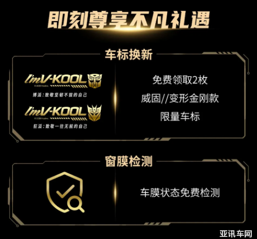 2020年,隨著威固品牌重塑的不斷完善,威固與孩之寶旗下核心IP變形金剛合作,為了紀(jì)念變形金剛的領(lǐng)袖精神,威固推出六大限量聯(lián)名車標(biāo)。其中尊貴的I‘m V-KOOL黃標(biāo)車主更能領(lǐng)取限量聯(lián)名車標(biāo),釋放您的領(lǐng)袖氣質(zhì)。