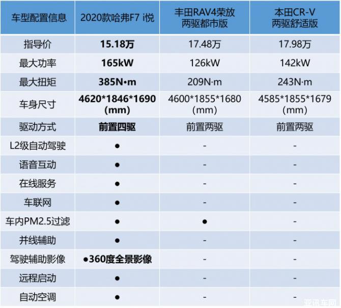 對(duì)比車型:2020款哈弗F7 i悅、本田CR-V兩驅(qū)舒適、豐田RAV4榮放兩驅(qū)都市版。