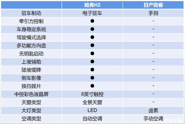 哈弗H2不僅在動(dòng)力、底盤方面有著明顯優(yōu)勢,車輛配置方面同樣更勝一籌。選擇售價(jià)接近的哈弗H2頂配車型,1.5T 雙離合兩驅(qū)智尚型(9.59萬元)與日產(chǎn)勁客入門車型,1.5L XE 手動(dòng)酷動(dòng)版(9.98萬元)對(duì)比配置。價(jià)格更高的日產(chǎn)勁客不僅只能選擇手動(dòng)擋車型,而且還比哈弗H2少了十余種功能配置。