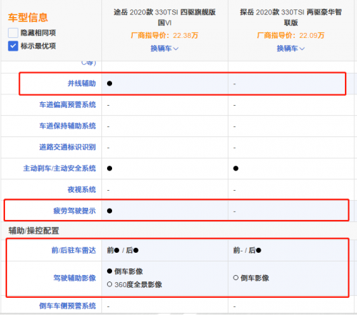 由于兩款車(chē)型在定價(jià)方面有所差別,為了方便比較,我們各自選擇價(jià)位接近的版本,分別為售價(jià)22.38萬(wàn)元的途岳330TSI四驅(qū)旗艦版,以及售價(jià)為22.09萬(wàn)元的探岳330TSI兩驅(qū)豪華智聯(lián)版,單看命名也足以看出,途岳這一版本配備了四驅(qū)系統(tǒng),并且這一版本屬于途岳的頂配版,因此可以預(yù)見(jiàn)探岳的這一版本在配置方面必然不如途岳,因此對(duì)于預(yù)算在這一價(jià)位的消費(fèi)者,選擇途岳的頂配版顯然比考慮探岳更香。
