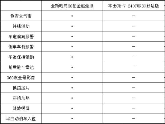 對(duì)比車型:全新哈弗H6 1.5T鉑金超豪版(以下簡(jiǎn)稱全新哈弗H6)/本田CR-V 240 TURBO 舒適版(以下簡(jiǎn)稱本田CR-V)