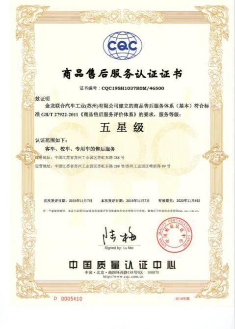 2019年,經(jīng)過近一年的對標(biāo)學(xué)習(xí)、自查自糾、改進(jìn)完善、外審評價等工作流程,蘇州金龍以96.7分的高分獲得了中國質(zhì)量認(rèn)證中心(簡稱CQC)頒發(fā)的《商品售后服務(wù)評價體系》“五星級”證書,成為江蘇省首家CQC認(rèn)證的售后服務(wù)水平達(dá)到五星級標(biāo)準(zhǔn)的客車制造企業(yè),也標(biāo)志著海格客車在為客戶需求提供整體解決方案基礎(chǔ)上,通過實(shí)施服務(wù)轉(zhuǎn)型升級,延展和提升了服務(wù)價值鏈,形成了競爭新優(yōu)勢。