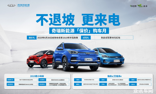為解決消費(fèi)者受新能源汽車補(bǔ)貼“退坡”而產(chǎn)生的購買焦慮,奇瑞新能源在5月份特別推出“不退坡 更來電”奇瑞新能源保價購車月優(yōu)惠活動,為廣大消費(fèi)者?!皟r”護(hù)航,活動一經(jīng)推出便受到廣大用戶稱贊。而隨著六月盛夏的到來,用戶出行生活中購車需求也將逐漸增多,為讓更多消費(fèi)者在六月享受到這份福利,輕松實(shí)現(xiàn)購車,始終踐行“客戶至上”的奇瑞新能源決定將保價購車月優(yōu)惠活動進(jìn)行到底:6月30日前,購買奇瑞新能源汽車的消費(fèi)者可續(xù)享2019 年補(bǔ)貼政策;另外,活動期間(6月30日前)到店試駕還可享受99元紅包,實(shí)實(shí)在在的優(yōu)惠福利,為用戶打造極具性價比的試購車體驗(yàn)。