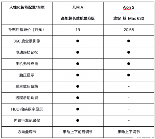 其實(shí),男人選擇伴侶都希望她能知你、懂你,這樣一起走過(guò)的人生才能多一些默契少一些爭(zhēng)執(zhí),選車亦是如此。但何為“懂你”?這要從汽車的人性化配置上尋找答案。小編分別選取了配置最為豐富的幾何A和Aion S的頂配版車型進(jìn)行比較,發(fā)現(xiàn)售價(jià)更低的幾何A,卻擁有更豐富且實(shí)用的人性化配置。