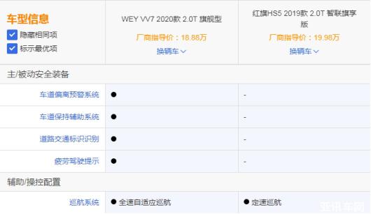 既然WEY VV7與紅旗HS5都被大眾稱(chēng)之為智能豪華SUV,那么究竟智能在何處呢?這方面從圖表中不難看出,WEY VV7配置相較紅旗HS5更為豐富,多出了車(chē)道偏離預(yù)警、車(chē)道保持輔助等功能,同時(shí),還有極具科技感的AI智能面部識(shí)別,如果駕駛員邊開(kāi)車(chē)邊打手機(jī)或者注意力分散和乘客聊天,中控就會(huì)及時(shí)語(yǔ)音提示駕駛員集中精神,提升了安全性和行車(chē)便捷。另外,在巡航系統(tǒng)也有差異,WEY VV7配備的是ACC全速范圍自適應(yīng)巡航系統(tǒng),可依據(jù)實(shí)際行車(chē)情況進(jìn)行制動(dòng)、減速、加速,徹底解放駕駛員雙腳,僅把握方向即可,而紅旗HS5搭載的還是普通的定速巡航系統(tǒng),需要駕駛員在進(jìn)行方向調(diào)整的同時(shí)控制好剎車(chē),不利于乘車(chē)安全。