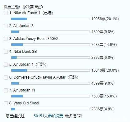 截止目前,活動已經(jīng)累計(jì)收獲超過8萬人投票,從虎撲JRs海選提名的24雙球鞋中決選投票的三強(qiáng)總決賽已落下帷幕,“潮鞋之王”的潮鞋研究報(bào)告榜單也正式出爐。在這場無潮鞋、不時尚的領(lǐng)潮比拼當(dāng)中,Nike Air Force 1最終以1萬多張選票成功壓制AJ1、AJ 11、Adidas Yeezy Boost 350V2等Sneaker的心頭好,最終勇奪“潮鞋之王”桂冠。