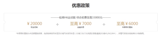 我們可以看到,哈弗H6運(yùn)動版有共三款車型,分別為哈弗H6運(yùn)動版手動精英型、哈弗H6運(yùn)動版自動精英型、哈弗H6運(yùn)動版自動尊貴智聯(lián)型,官方指導(dǎo)價在10.4萬-12萬不等。同時得益于哈弗H6的產(chǎn)銷規(guī)模優(yōu)勢,每一輛車均能做到攤薄成本,因此它們的促銷活動真的是對消費(fèi)者的最佳回饋,如當(dāng)前的限時抄底活動,可享現(xiàn)金優(yōu)惠20000元,金融貼息至高7000元,專享置換補(bǔ)貼至高6000元,綜合至高優(yōu)惠3.3萬元,減輕了消費(fèi)者的購車壓力。