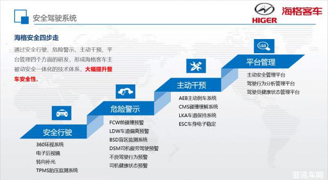 隨著社會(huì)的不斷發(fā)展,人們對(duì)出行安全的要求越來越高,客運(yùn)企業(yè)也在安全上投入更大精力,客車生產(chǎn)企業(yè)作為車輛的提供商更是在政府、市場(chǎng)需求和社會(huì)責(zé)任的三重推動(dòng)下加大了對(duì)客運(yùn)安全的投入和探索。從“安全用心 服務(wù)貼心”到“安全為本”,蘇州金龍持續(xù)多年深耕客車安全,倡導(dǎo)全行業(yè)安全意識(shí)鏈的打造,并利用先進(jìn)的智能網(wǎng)聯(lián)技術(shù),提出“海格安全四步走”,通過安全行駛、危險(xiǎn)警示、主動(dòng)干預(yù)、平臺(tái)管理四個(gè)方面的研發(fā),形成了海格客車四位一體的智能安防體系,大幅提升了行車安全性。
