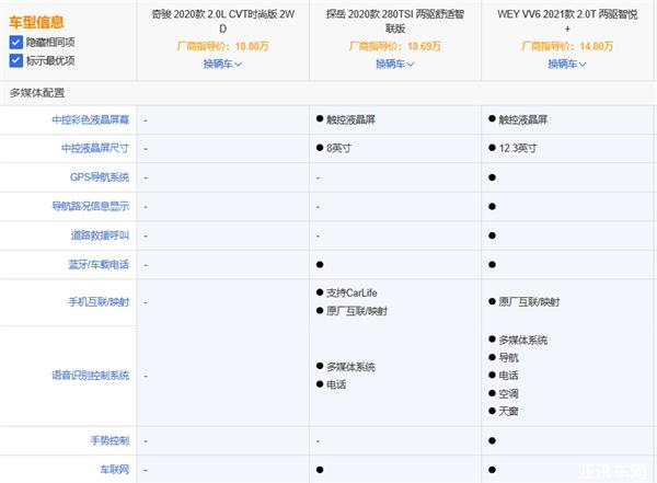 考慮到這一點,我把市場中口碑較不錯的奇駿(2020款2.0L CVT時尚版 18.88萬起)、探岳(2020款 兩驅(qū)舒適智聯(lián)版18.69萬起)、WEY VV6(2021款2.0T 兩驅(qū)智悅+ 14.80萬起)拿來對比一番,大家可來圍觀一波。