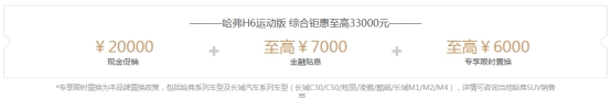 目前,哈弗品牌鉅惠活動正在火熱進(jìn)行中,購買官方指導(dǎo)價10.4-12萬的哈弗H6運動版可享受現(xiàn)金促銷20000元,至高金融貼息7000元,至高專享限時置換補貼6000元,共計至高3.3萬元的綜合鉅惠,絕對是福利多多,誠意滿滿。
