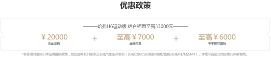 哈弗H6運(yùn)動版為了減輕首購家庭購車壓力,推出了現(xiàn)金優(yōu)惠20000元,金融貼息至高7000元,專享置換補(bǔ)貼至高6000元,綜合鉅惠至高3.3萬元,這點(diǎn)讓我給哈弗H6運(yùn)動版打了很高的印象分。其次,還推出了超低首付1.68萬起,24期0息,至高7萬限額貸;36息0息,月供低至1389元兩款金融政策,對于資金緊張的我們是再合適不過了。