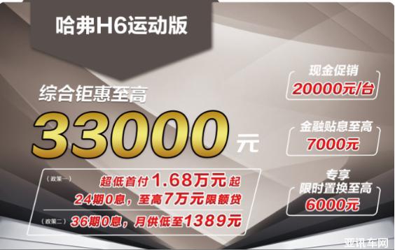 哈弗H6運(yùn)動(dòng)版目前開啟限時(shí)抄底活動(dòng),只要購買哈弗H6運(yùn)動(dòng)版就可享受至高33000元的綜合鉅惠,內(nèi)含20000元現(xiàn)金促銷、至高7000元金融貼息和至高6000元限時(shí)置換。并且,更是傾情推出多種0息貸款方案。如,針對(duì)資金不寬裕但月收入較高的消費(fèi)者,可選24期0息貸,首付只需1.68萬的。針對(duì)手里有一定儲(chǔ)蓄,但收入中等的消費(fèi)者,可選擇36期0息貸,日供只需要46.3元,工薪階級(jí)也可輕松享受擁車生活。
