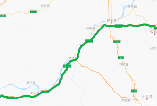 大約過了依蘭不久,哈同高速的路面起伏變得頻繁,長下坡和長上坡的路段接踵而至。在49噸左右的總重下,這臺解放J7的動力儲備還是相當(dāng)?shù)某渑?在到達(dá)坡底的時候?qū)O剛熟練的將擋位掛入了11擋,以確保沖坡的時候不會出現(xiàn)“悶車”的情況。如果換成500馬力的車,可能要掛入10擋或者更低。