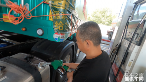 開始的時候并沒有加很多的油,所以在孫剛行駛將近4小時的時候,趁著機器沒有報警,我們在擺渡服務(wù)區(qū)加了第一次柴油,4.65元/升,這臺解放J7用的是500L+500L雙油箱設(shè)計,以減少駕駛員進(jìn)出加油站的次數(shù),提升時效。但考慮到本次跑車距離不長而且他知道有更便宜的油站,所以孫剛選擇僅加注2500元的燃油。