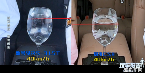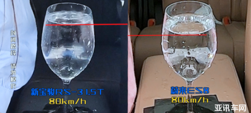 在測試過程中,我們可以明顯看到蔚來ES8在以車速40km/h通過極限顛簸路面時,車內(nèi)放置的盛滿水的杯子水花四濺,這表明了蔚來ES8的底盤在過濾路面顛簸感方面,稍顯不足。相反,新寶駿RS-3以車速40km/h通過極限顛簸路面時,車內(nèi)盛滿水的杯子只是灑出少量水花,這表明新寶駿RS-3的底盤在化解路面顛簸感方面的能力是不錯的,并可以給到車內(nèi)乘客舒適的乘坐體驗。