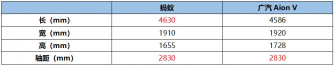另外,空間上,螞蟻和廣汽Aion V在數(shù)據(jù)上互有贏弱,軸距均為2830mm,但螞蟻的車身長度更長,且0.611的軸長比也以越級空間尺寸實(shí)現(xiàn)了乘員艙空間最大化。