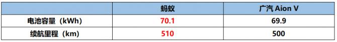 再看廣汽Aion V,雖然其同樣搭載了三元鋰動(dòng)力電池,但續(xù)航里程僅500km,跟螞蟻相比有著10km的續(xù)航劣勢,且電池容量僅69.9kWh,也略低于螞蟻。